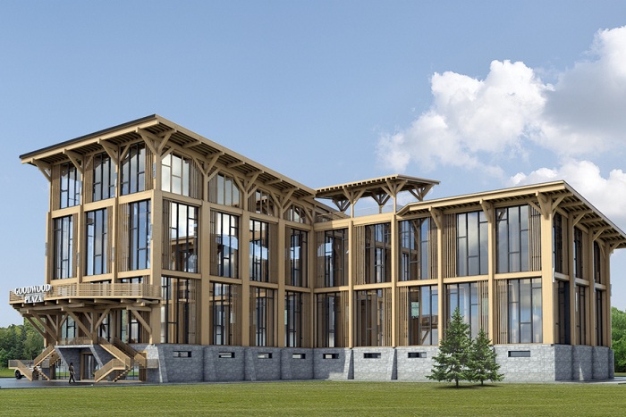 Первым же «официальным» деревянным многоэтажным зданием стал офисный центр «Good Wood Plaza», построенный в 2017 году компанией Good Wood в Зеленограде. По словам владельцев компании, проект по-большей части имиджевый, рекламный, большой практический нагрузки не несущий.