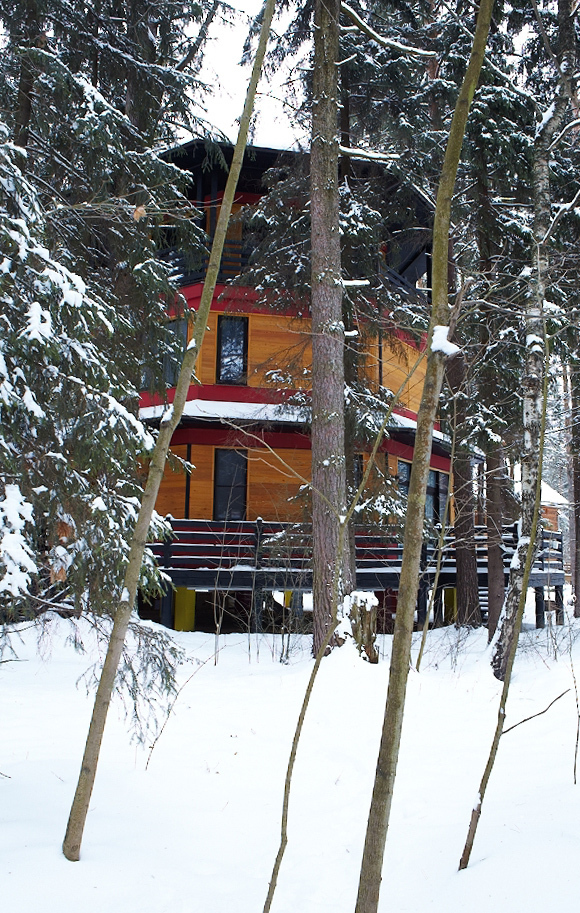 Снаружи дом выглядит не менее экстравагантно — он представляет собой восьмиугольную башню с броским желто-красным фасадом, хорошо заметным среди высоких сосен. «Нам важно было вписать дом в участок так, чтобы не пришлось пилить деревья. А это удавалось только при такой конфигурации, — рассказывает Троицкий. — Изначально была идея сделать дом круглым, как у архитектора Мельникова, но оказалось, что это сложно и дорого. Восьмиугольник строить намного проще, и мы подумали, что октагон — тоже хорошо».
