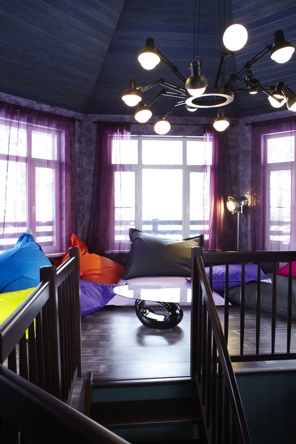 Когда герою Шона Коннери наконец удается разрушить все злодейские козни, мы перемещаемся из гостиной в большую комнату на третьем этаже. Она целиком отведена под лаундж-зону, и у меня на пару секунд возникает ощущение, что я попала внутрь программы «Кафе Обломов», которую Троицкий вел в середине 1990-х, — половина помещения превращена в огромное лежбище, заваленное цветными подушками.