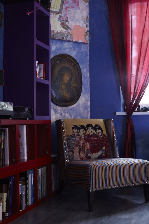 «Наш „банно-прачечный комбинат“ — душ, джакузи и прочее — выдержан в сине-бело-желтых тонах. И дверь там желтая. Рядом туалет, он красно-синий, и дверь там красная. То же самое в других комнатах», — объясняет Троицкий (тоже одетый во всё цветное), по какому принципу они с женой Верой выбирали краску.