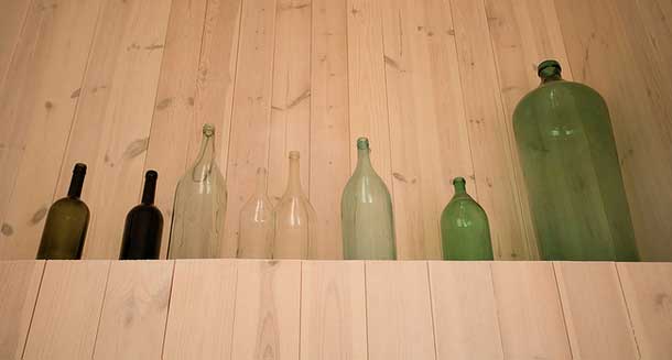 На платяном шкафу в коридоре — коллекция бутылей, собранная в путешествиях по средней полосе России.