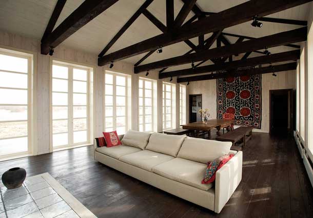 Гостиная с французскими окнами напоминает оранжерею. Стены обшиты выбеленной доской. «Дом должен соответствовать месту, где он стоит, — говорит Юлия. — В Завидове он может быть только деревянным». Диван, Flexform.