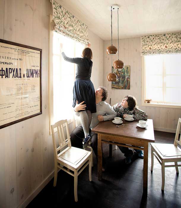 Юлия, Илья и Матвей Осколковы на кухне дома в Завидове. На стене — афиша спектакля «Фархад и Ширин» 1946 года. Костюмы для этого спектакля делала бабушка Ильи Осколкова, Алла Левашова.