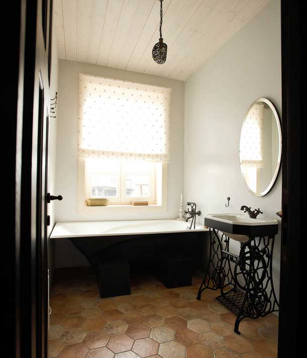 Чугунная ванна, Jacob Delafon, покрашена в черный цвет и поставлена на два деревянных бруска. Абажур сделан из металлической оплетки для бутыли, а подстолье для раковины — из старой швейной машинки.