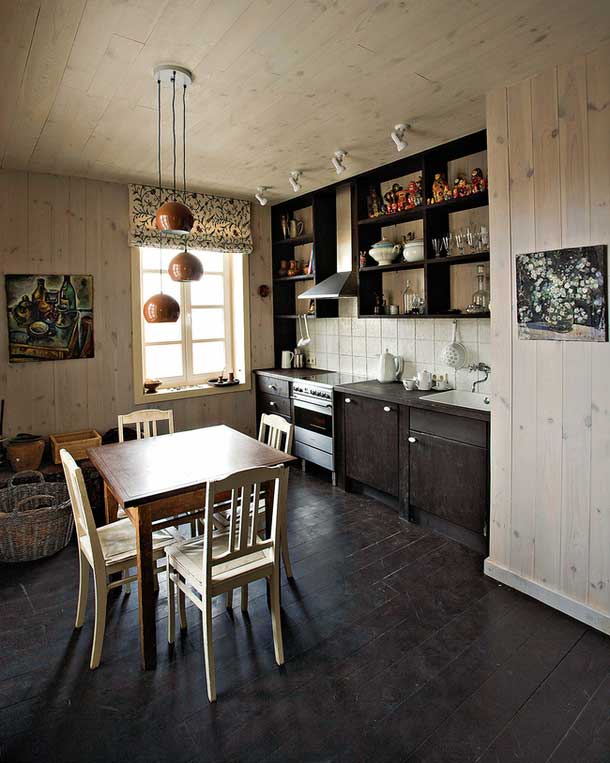 Полки и шкафчики, в которые встроена техника, сделали строители из подручного материала — обычной сосновой доски.