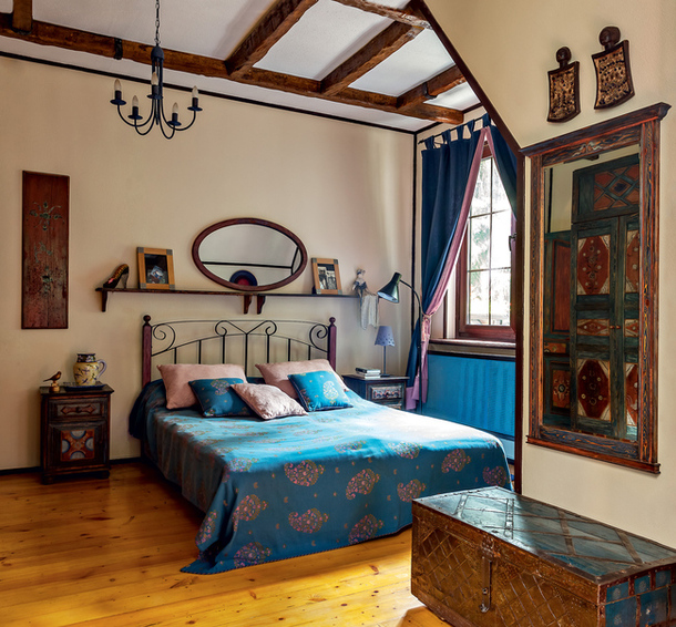 Спальня. Елена Чекалова: «Старинный русский сундук, свадебные деревянные фигурки с острова Занзибар, филенки старых шкафов, вставленные в остовы мебели из IKEA, покрывало и подушки Etro — сложить такую мозаику непросто, но это гораздо интереснее, чем копировать картинки из мебельных каталогов».