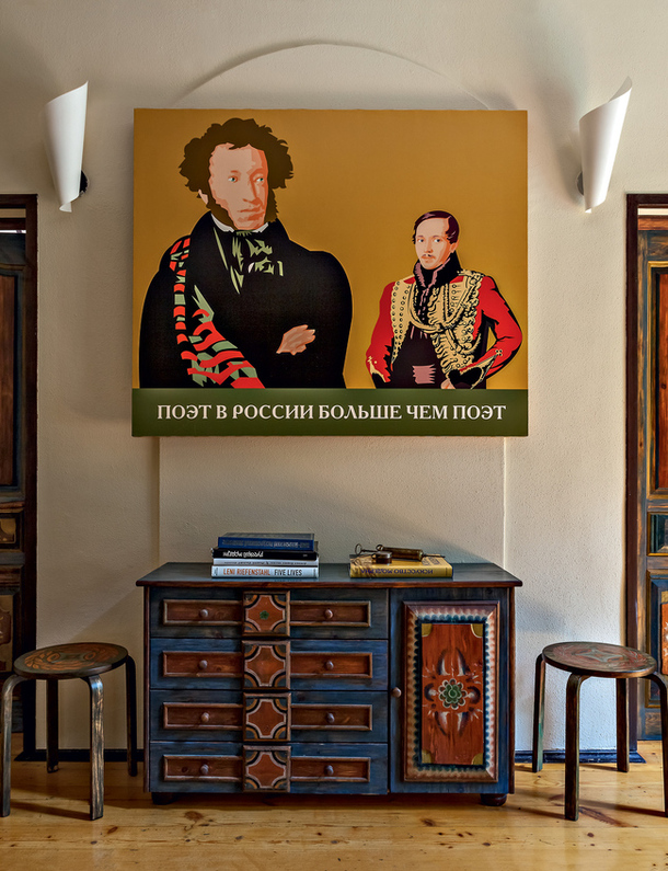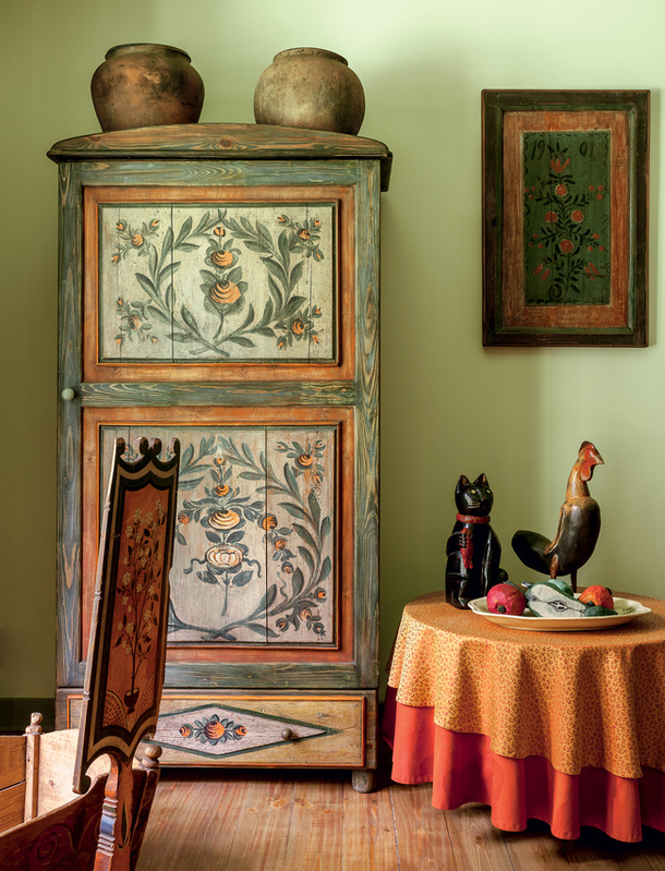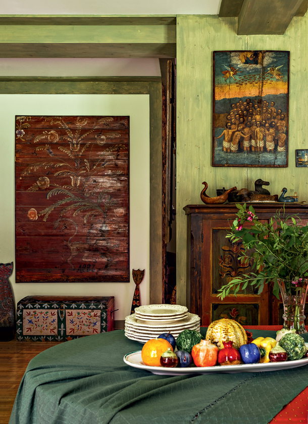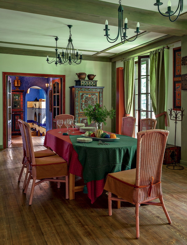Фрагмент гостиной-столовой. Леонид Парфенов: «Такая расписная мебель есть в Финляндии, в Альпах — везде, где долгая зима и хочется цвета в домах. Но в нашей больше простодушия, мне кажется, меньше насмотренности».