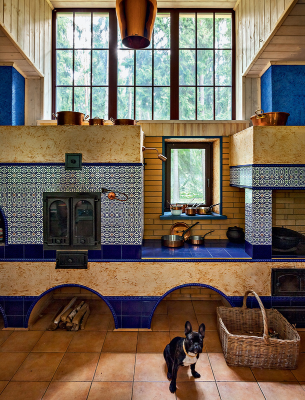 Кухня. Елена Чекалова: „Я всегда мечтала иметь кухню с печкой. Мы разместили ее в пристройке из соображений безопасности. Я выбрала стиль мудехар, яркий и радостный. Глина, плитка, стекло — это всё натуральное, фактурное, приятно касаться“.