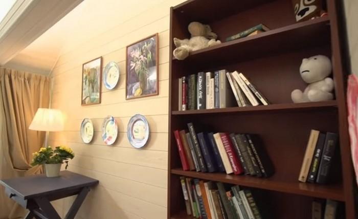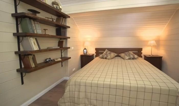 За счет отделки стен в светлых тонах и такого же тепло-молочного текстиля удалось зрительно расширить небольшое пространство комнаты. В помещении расположили небольшую кровать, столик, комод и открытые стеллажи для разнообразных книг и сувениров. Комнатка получилась хоть и небольшой, но очень светлой и теплой.