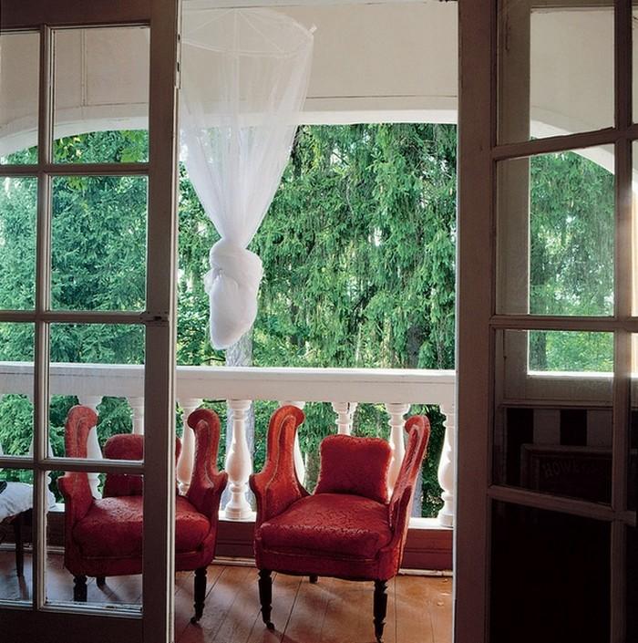 Рядом с балконом поставили кресло-качалку из натурального дерева и кофейный столик, сделанный из старого сундука, который нашли на участке. Там же на участке нашли старую чугунную печку, отреставрировали и вписали в новый интерьер.