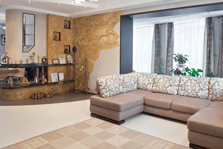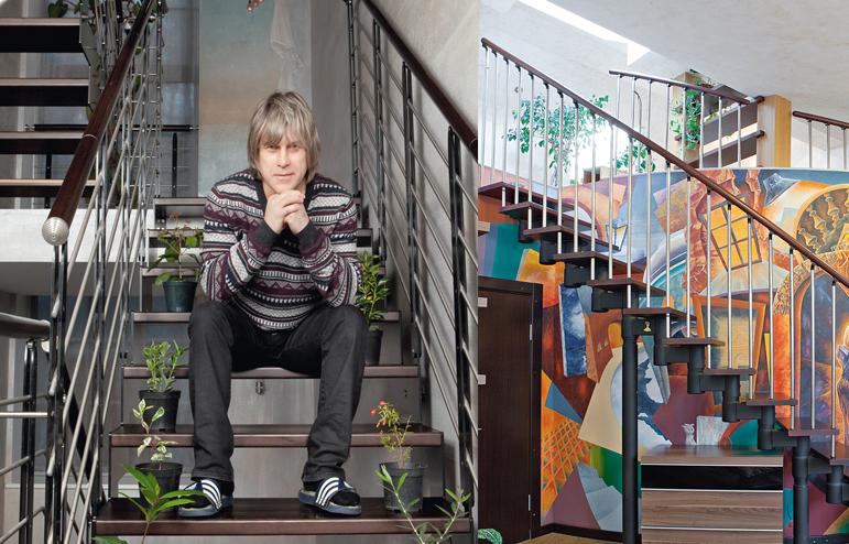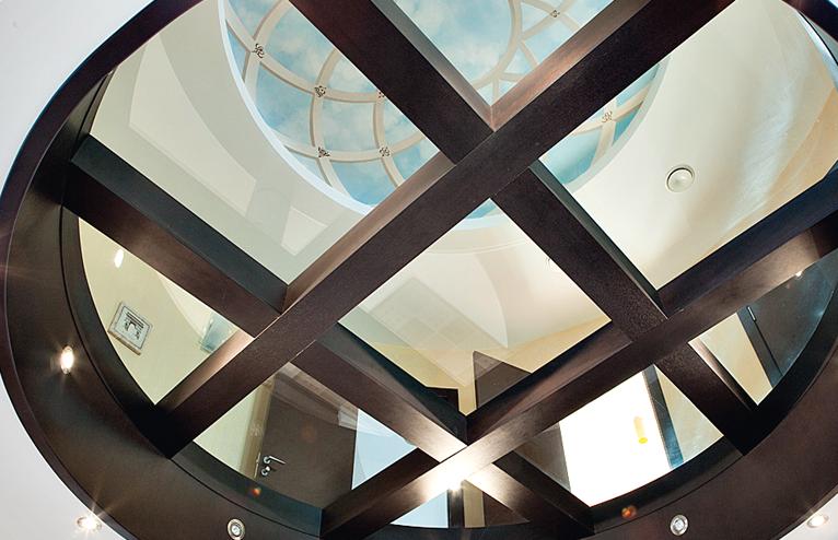 Одна из оригинальных идей Алексея – пробить окно в полу второго этажа. Пробить в прямом смысле этого слова, так как пол уже был сконструирован и пришлось долбить бетонный пол толщиной почти в 40 см. Результат получился завораживающий - само по себе окно выглядит великолепно, но через него теперь стало видно необычную роспись-обманку расположенную на потолке верхнего этажа. Под стиль получившегося окна, в камине был проделан сквозной проем.