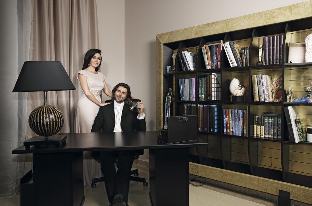 Для деловых людей, таких как Заворотнюк и Чернышев, не обойтись в доме без кабинета. Эта комната сделана в стиле всего архитектурного проекта. Здесь нет излишеств, только рабочий стол с оригинальной лампой и большой стеллаж со множеством разнообразных книг.