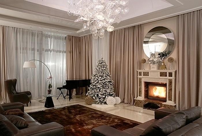 В гостиной установлен настоящий работающий камин, над ним висит большое круглое зеркало в оригинальном дизайне, на полке светло бежевого камина стоят золотые часы и оригинальные предметы интерьера. Вокруг всей этой красоты расположилась мягкая зона. Большие диваны выполнены из кожи в темно коричневом цвете.