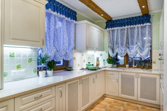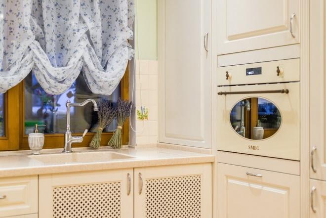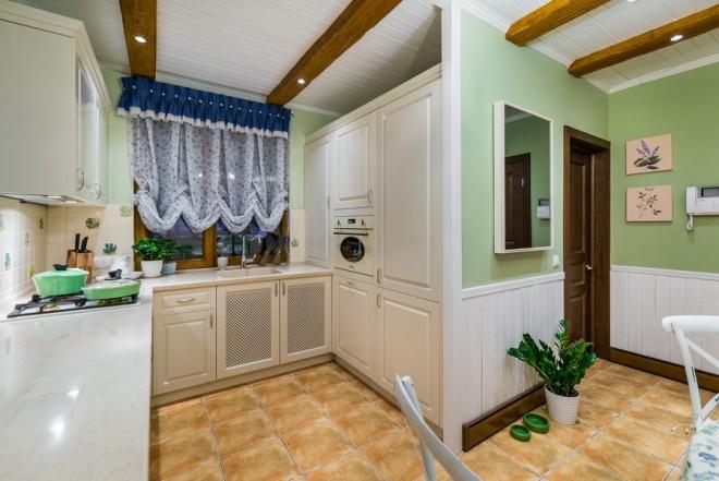 Все убранство этого помещения было кардинально изменено. По периметру расположили рабочую зону в светлых тонах, а над ней установили несколько навесных шкафов, холодильник спрятали на входе в комнату. Фартук облицевали коллекционной плиткой, сделанной вручную.