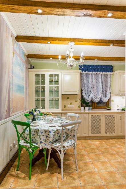 Изюминкой проекта стала люстра в классическом английском стиле, которая идеально вписалась в белый вагончатый потолок со светло-коричневыми балками.