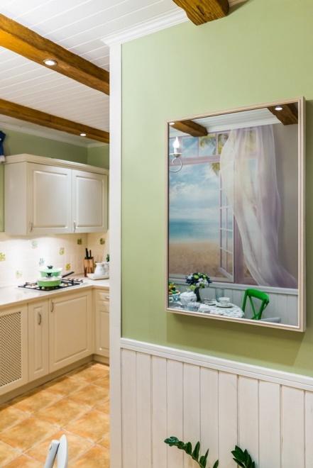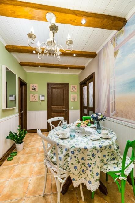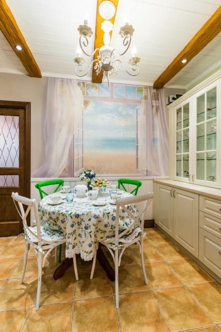 Фреску выполнили специальным методом нанесения декоративной штукатурки. Рисунок можно мыть и даже чистить. По низу пустили белую вагонку.