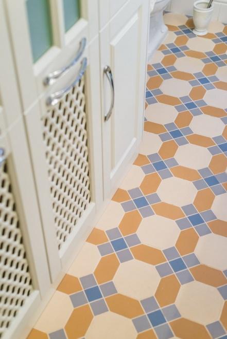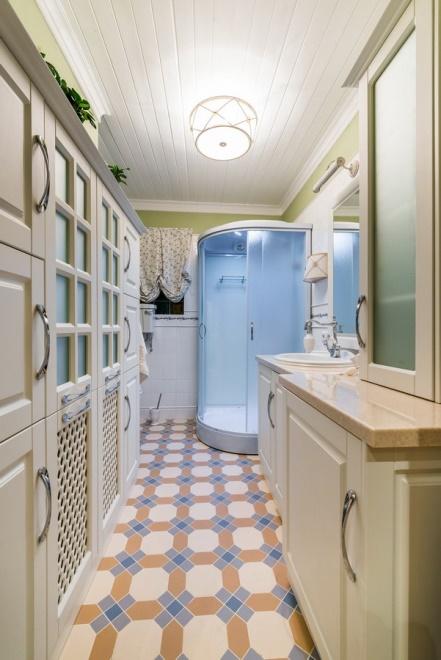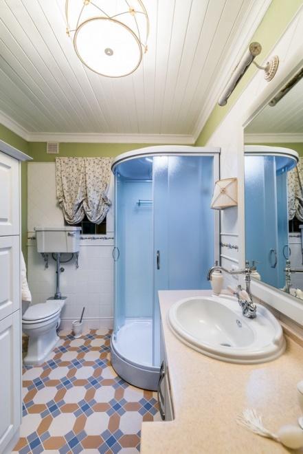 Также привели в порядок ванную. Здесь на пол уложили оригинальную керамическую плитку, установили качественную сантехнику, а светильники подбирали с повышенной влагостойкостью.