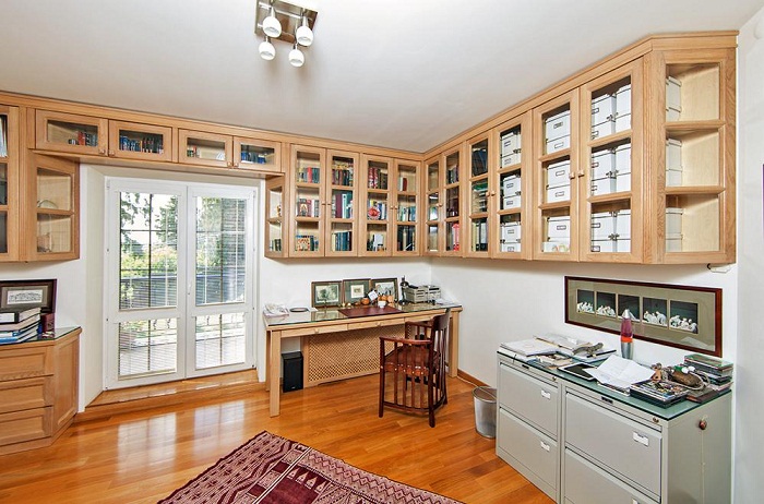 Неотъемлемой частью любого загородного дома является камин, возле которого любит проводить время вся семья. Он здесь небольшой и скорее для тепла, нежели для антуража. Все внимание приковано только к шкафам с книгами. Егор в свободное время любит в этой комнате посидеть в тишине, почитать интересную книгу и выпить огромную кружку зеленого чая. Посередине гостиной для этого установлен большой кожаный диван в теплых коричневых тонах подстать всему интерьеру дома. Все здесь говорит об образованности, начитанности и любви владельцев дома к кинематографу.