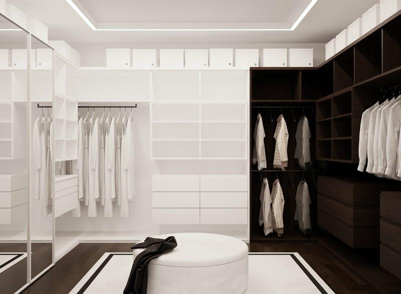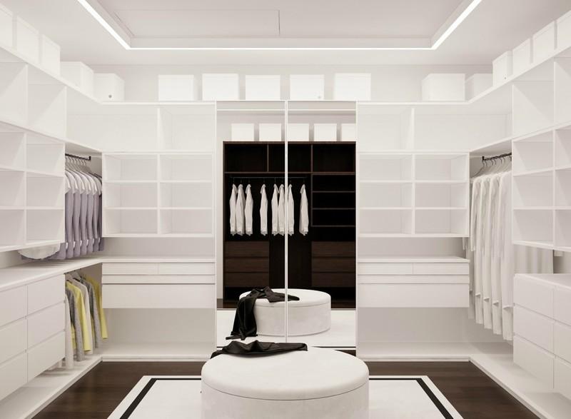 Большая и абсолютно белая, с выдвижными зеркальными дверями, гардеробная разделена на две части – «для него» и «для неё».