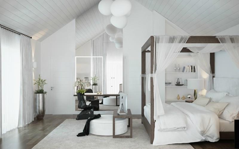 Спальня хозяев выдержана в таких же белых цветах. Посередине комнаты на стене установлено огромное зеркало, а в центре внимания большая деревянная кровать с балдахином, которуюмечтала увидеть в своем интерьере Елена.