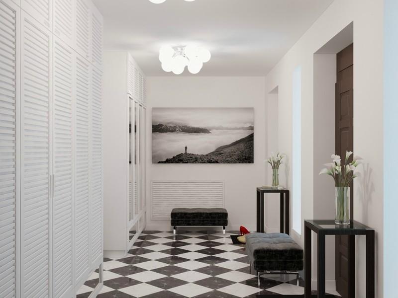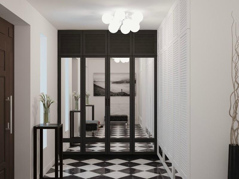 В холе решили установить два огромных шкафа (от пола до потолка) со стеклянной отделкой, что зрительно значительно увеличивает пространство. Для удобства разместили два небольших пуфа.