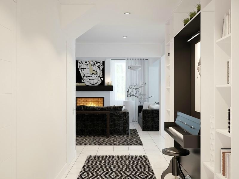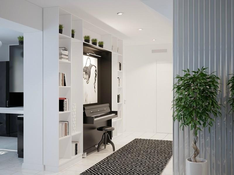 В небольшую нишу по пути в гостиную очень гармонично вписалось пианино, встали многочисленные книги и растения.
