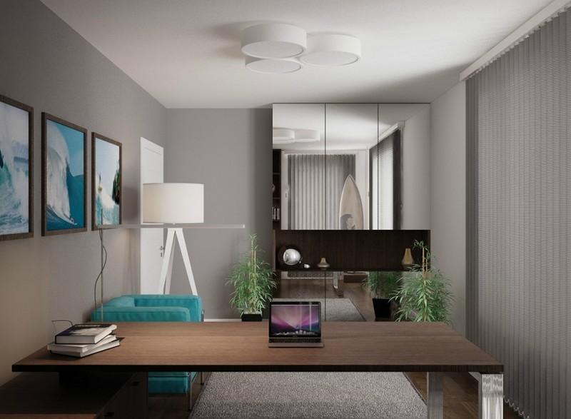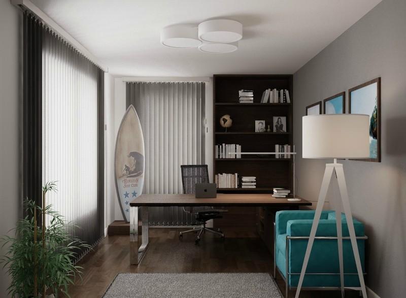 Кабинет выполнен с бирюзовыми элементами, в нем сразу угадывается любимое хобби хозяина – серфинг. Здесь, также как и в других комнатах, нет ничего лишнего, но черный цвет уже сменяется темно-коричневым и все внимание акцентируется на бирюзовом цвете кресла.
