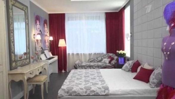 Основным решением стали серые стены, белая мебель и бордовый занавес вместо двери. Прямо над кроватью врезали зеркальную панель, а по периметру расположили некоторое количество светильников. Рядом с маникюрным столиком поставили небольшое пианино, а на стене повесили картину в стиле «Мерлин Монро».