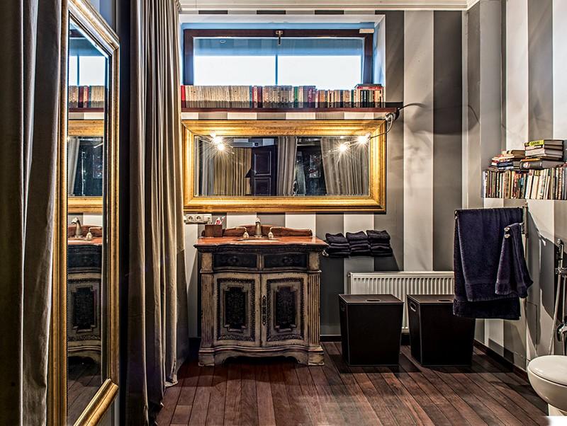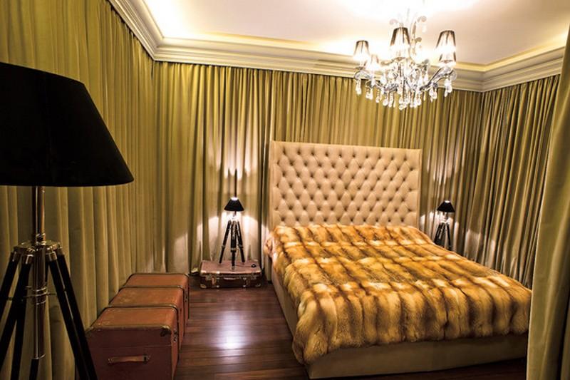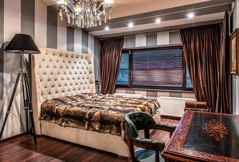 Центральное место в спальне занимает просторная кровать, а стены и окна задрапированы портьерной тканью, создается ощущение нахождения на сцене. Полы здесь отделаны корабельной доской.