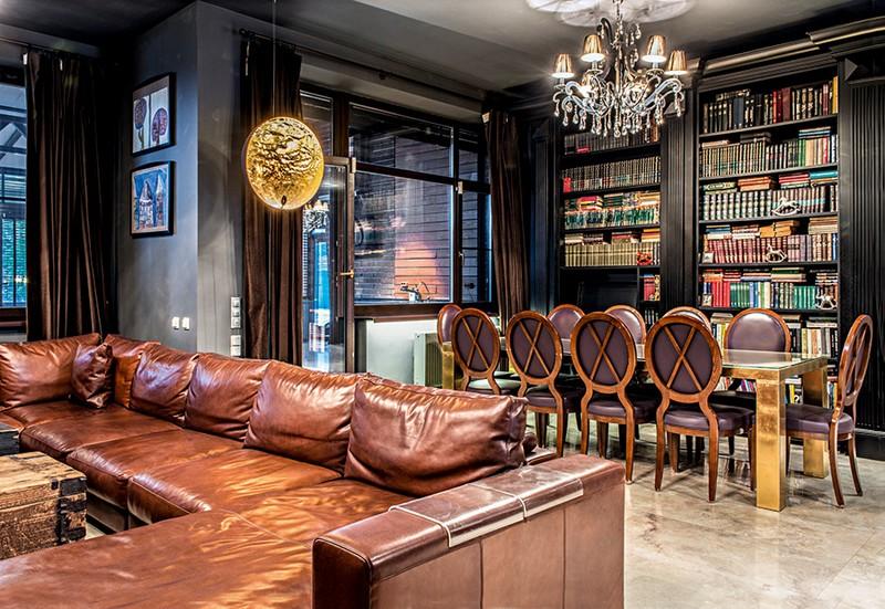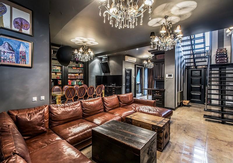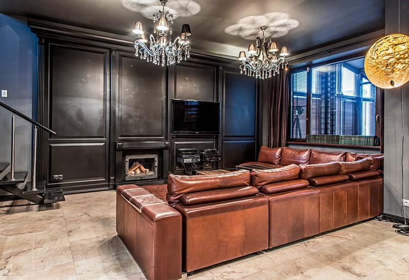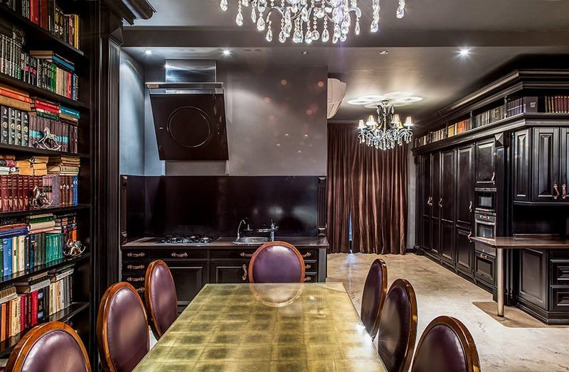 Особняк выполнен в современном европейском стиле. На первом этаже расположены большая гостиная, кухня и обеденная зона. Стены здесь отделаны большими дубовыми слебами, полы выложены керамогранитом, а потолок окрашен серой краской. Длинный стол для гостиной заказывали из Италии, он покрыт сусальным золотом.