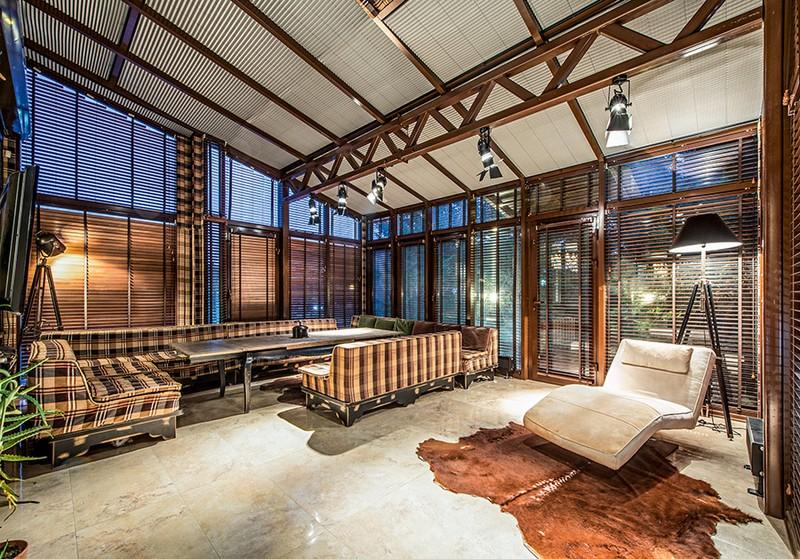 Одним из самых любимых мест хозяйка считает закрытую террасу размером в пятьдесят квадратных метров, на которой она часто собирает друзей. Здесь стоит огромных размеров диван и подстать ему прямоугольной формы стол. Окна и дверь на улицу закрыты деревянными жалюзи, а для яркого акцента рядом с одной из стен стоит белоснежное кресло для массажа.