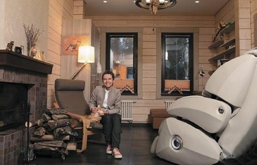 В гостиной установлен оригинальный стеклянный камин, рядом с ним приятно отдыхать холодными вечерами, а рядом массажное кресло оригинальной формы.