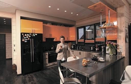 Весь дизайн здесь выполнен в бежево черных тонах и только кухня отличается ярко-оранжевой раскраской. По задумке хозяйки сделано это для того, чтобы даже в пасмурный день здесь было светло и радостно.