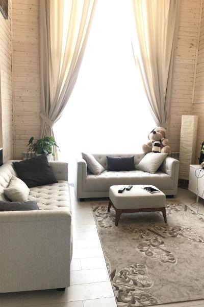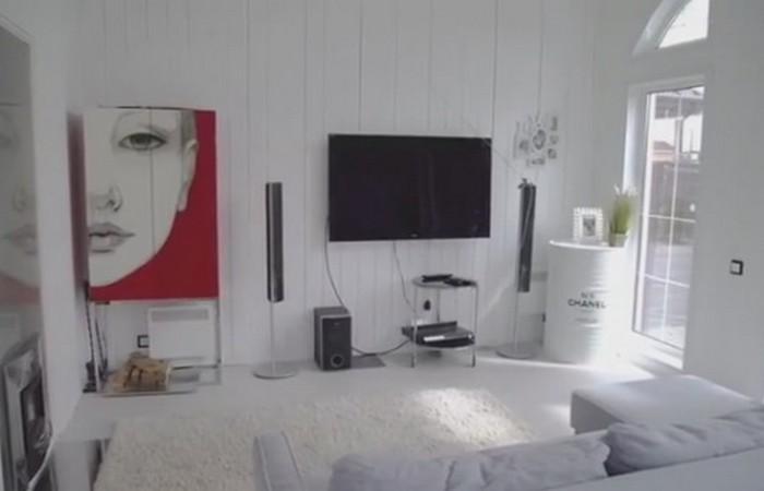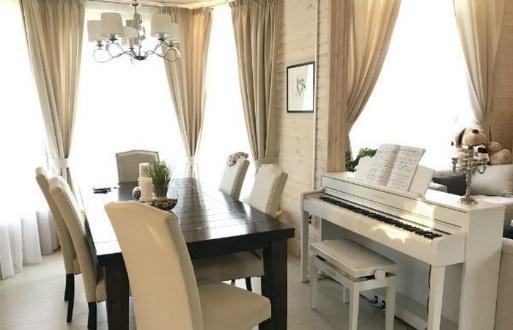 Фасад здания отделан темным деревом, а все внутреннее оформление выполнено в светло-молочном цвете с белоснежными элементами в интерьере. Центральное место в гостиной занимает мягкая зона и большой обеденный стол, напротив него стоит белоснежное пианино, за которым хозяин придумывает композиции для своей дочери.