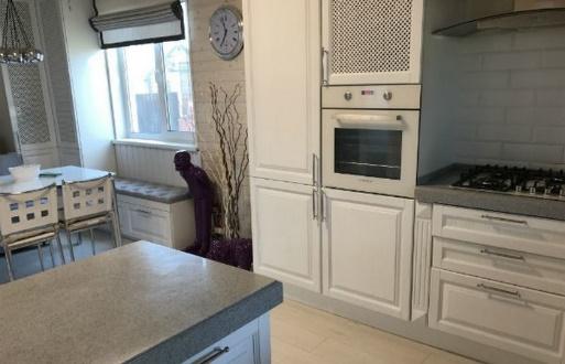Кухонная зона также идеально продумана по функциональности. Здесь имеется место не только для приема пищи и ее приготовления, но и место для отдыха. Кухонный гарнитур делался на заказ.