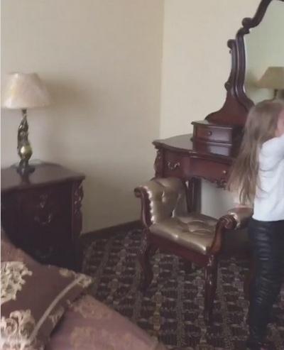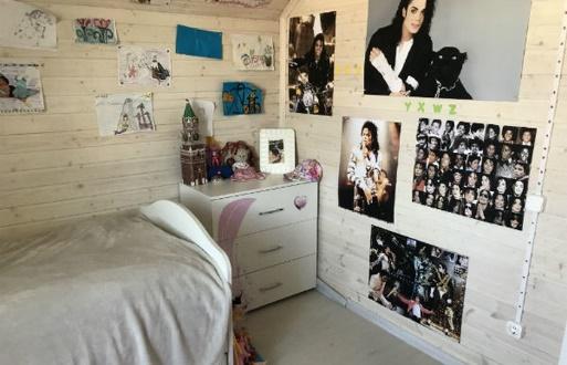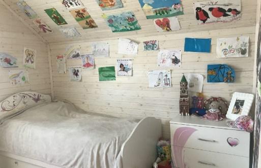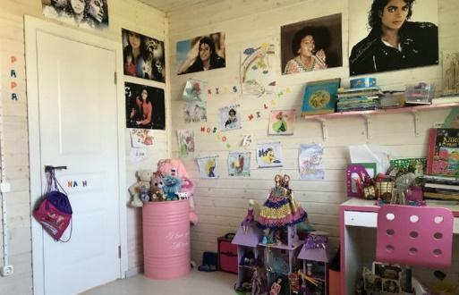 Детскую на втором этаже украшают постеры Майкла Джексона и огромное количество разнообразных рисунков. Помещение светлое, как и все остальные в коттедже, но с небольшими розовыми акцентами в мебели.