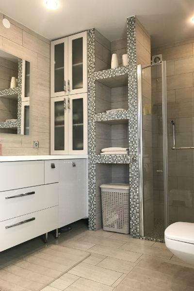 Ванная выполнена в минималистичном стиле, с большим количеством полочек и шкафчиков для хранения.