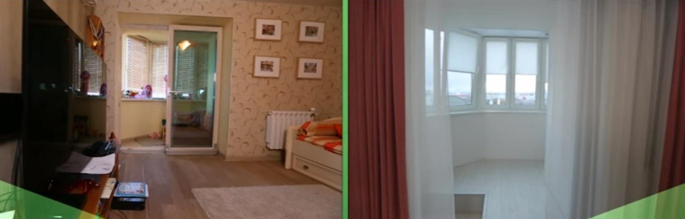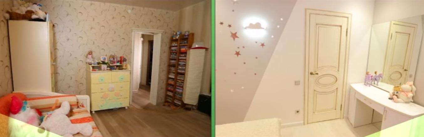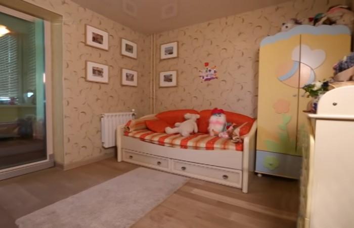 Саму комнату оформили в розовых тонах. Старую мебель вывезли в загородный дом Гогунских и установили новую, в таких же розовых и белых цветах. На лоджии заменили окна на более теплые, а стены выровняли и окрасили. Полы здесь также заменили.