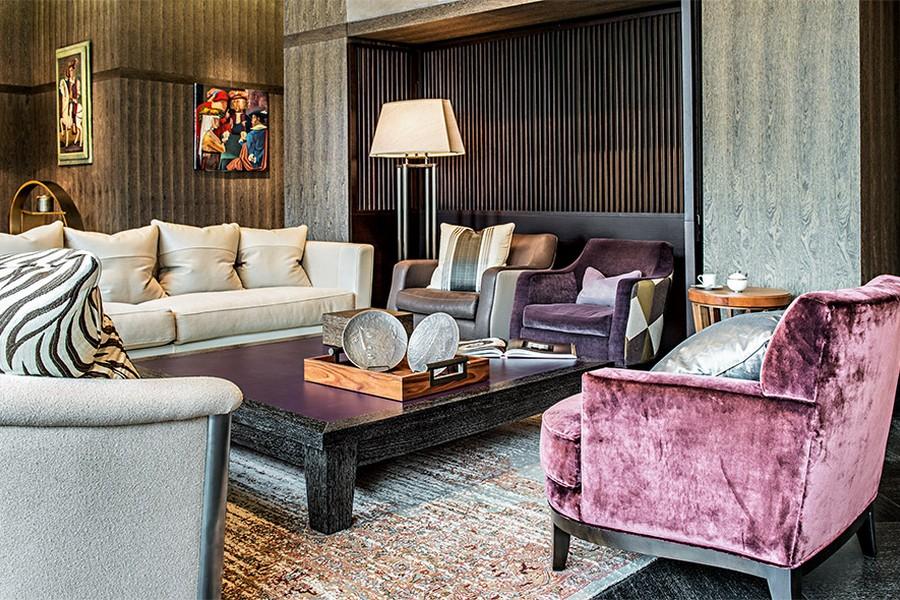 Гостиная зона выполнена в темных цветах со светлыми, сиреневыми акцентами. Вокруг вмонтировано большое количество точечного освещения и установлены светящиеся панели.