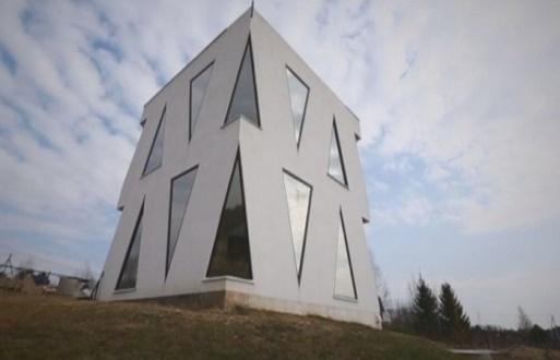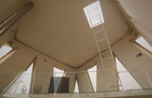 В проекте дома много треугольных окон, два из которых открываются для проветривания. Двери как таковой тоже нет. Изначально стояла железная дверь, но она не вписывалась в проект и её было решено заменить на дверь, имитирующую окно, с противоударным покрытием. Все окна покрыты специальным зеркальным покрытием, днем со стороны улицы ничего не видно, а с наступлением ночи в каждом окне загорается свет, приглашая друзей зайти в гости.