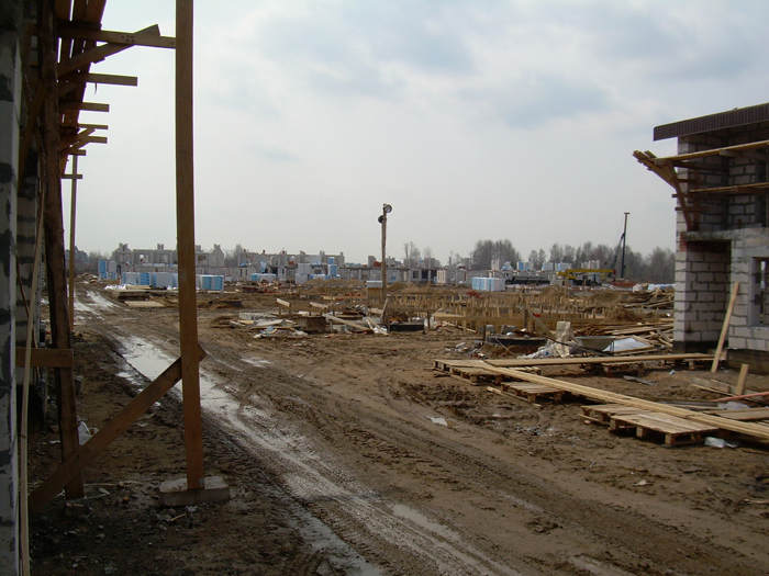 Застройщик готов благоустроить находящийся за территорией поселка карьер, сделать из него нормальный водоем. Однако пока он не оформлен в аренду, поэтому все это только в планах. Прошла со специалистом за шлагбаум. Обычная площадка с кипами строительных материалов. И целая улица, с двух сторон которой стоят двухэтажные дома с квартирами-таунхаусами.