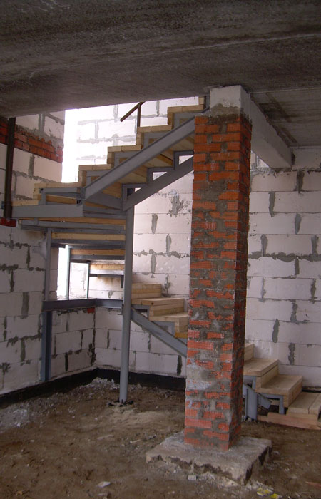 Менеджер показал мне одну из крайних квартир с торца дома площадью 84,6 кв.м с витражным окном на боковой стене. Окна — 2-камерные пластиковые стеклопакеты Rehau. Потолки здесь высокие. Расстояние до конька крыши — более 5 метров. Она утеплена, но изнутри не прошита, увидела там деревянные стропила. На второй этаж ведет сколоченная плотниками временная лестница без перил. Главное, что она устойчивая, а покупатель ее заменит.