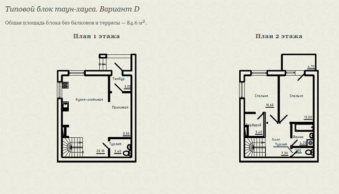 Все квартиры 2-этажные, свободной планировки, без перегородок, с отдельным входом, небольшим придомовым участком, с парковочными местами. На 1 этаже можно разместить холл, гостиную, кухню, на 2-м — одну или несколько спален, в зависимости от площади. Санузлы предусмотрены на каждом этаже. На сайте поселка есть информация о 8 вариантах типовых блоков таунхаусов, обозначенных латинскими буквами. Стоит обратить внимание, что вариант D отличается от B только тем, что эта квартира — крайняя в доме, поэтому там имеется боковое витражное окно на лестнице.
