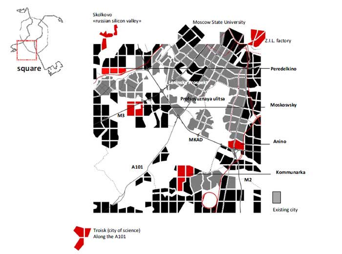 Свою концепцию развития Новой Москвы выдвинули голландские урбанисты из фирмы OMA. Они предложили распределить федеральные органы власти по нескольким городам-спутникам Москвы. Например, в Остафьево, где находится испытательный транспортный полигон, предложено расположить «транспортный блок» (Минтранс и Федеральное агентство железнодорожного транспорта), в наукограде Троицке «поселить» ведомства, связанные с энергетикой. А вот в Чкаловском разместить Министерство промышленности и торговли, в Зеленограде — Министерство образования и науки, в Рублево-Архангельском — Министерство финансов, Росстат и Росфинмониторинг.