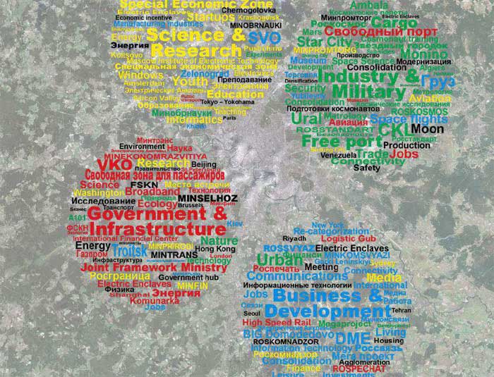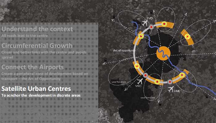 Интересной, хотя уже и не самой новой и свежей, получилась концепция французской группы I’AUS. Эта команда предложила создать линейный город в зоне расширения столицы. Центрами развития должны стать аэрополисы, которые должны возникнуть вокруг аэропортов «Шереметьево», «Внуково» и «Домодедово». Было предложено соединить все три главные московские «точки вылета» скоростным транспортом.
