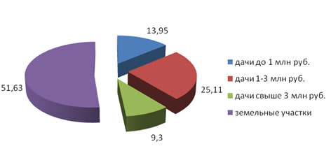 В сегменте дальних дач (далее 70–80 км МКАД) стоимость сотки земли колеблется в районе 30–50 тыс. руб., около 600 тыс. рублей стоит подключения коммуникаций. Например в коттеджном поселке «Ясногорье» (90 км от МКАД, Тульская область) готовый дом площадью 115 кв. м с коммуникациями на участке 10 соток стоит от 1,5 млн. руб.