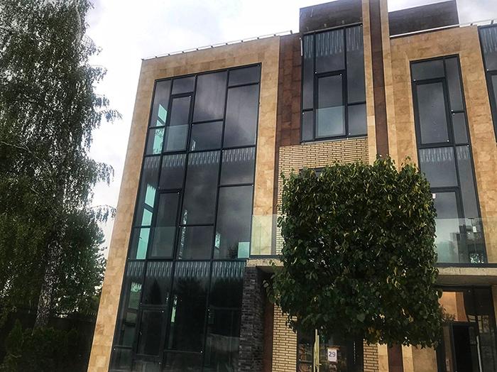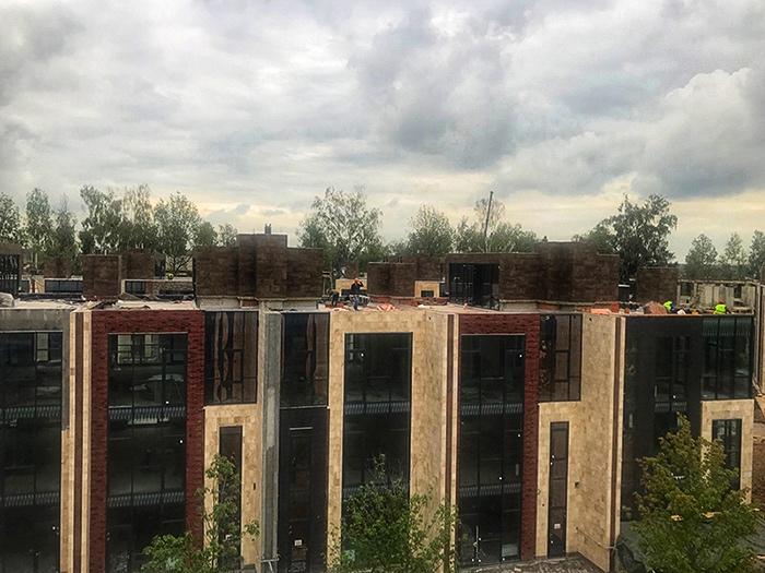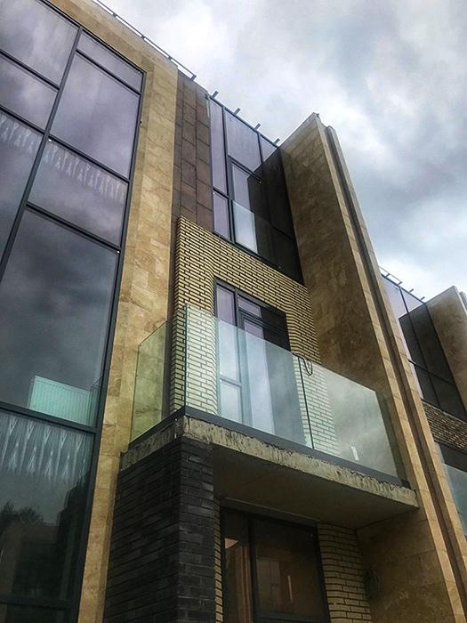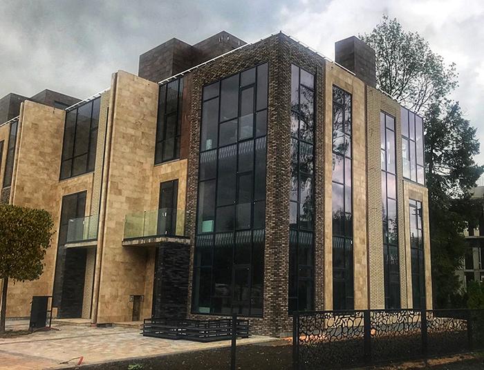 Снаружи геометрия зданий подчеркнута материалами контрастных цветов, форм и фактур: используются турецкий травертин, керамогранит и клинкер.