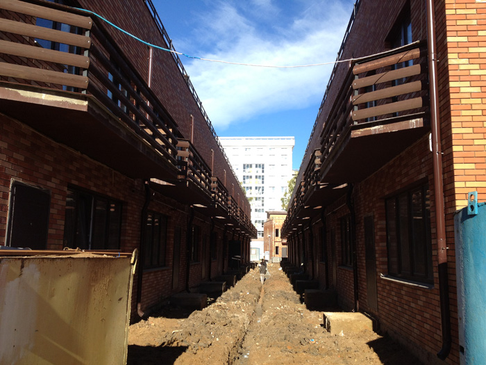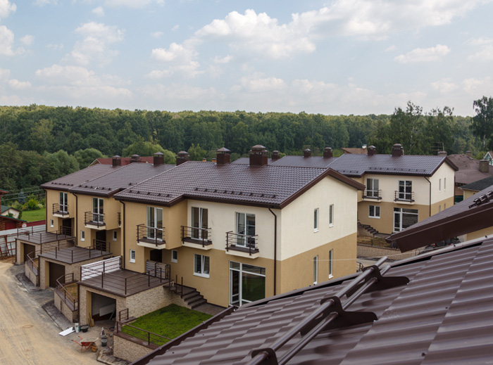 У первых рядов блоков таунхаусов нет задних двориков, на площадках перед таунхаусами совсем нет зелени - вся территория выложена плиткой. Поселок практически построен, везде ведутся ремонтные работы. В продаже представлены 3 варианта таунхаусов с небольшой разницей в метраже 127-130 м2, высота потолков 3 метра. На первом этаже расположен гараж, который можно перестроить в жилое помещение, второй этаж свободной планировки и эксплуатируемая крыша. Некоторые жители увеличивают площадь таунхауса за счет пристройки третьего этажа или закрытого балкона на втором этаже, контроля со стороны управляющей компании за сохранением первоначального вида фасадов нет.