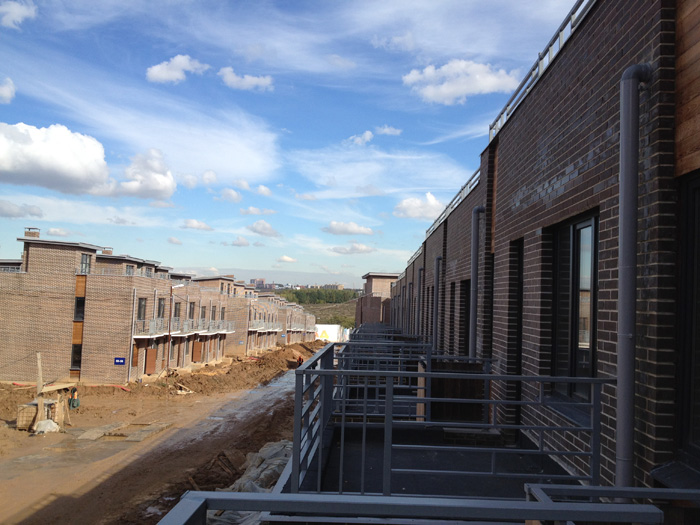Все таунхаусы строятся из кирпича, а посмотреть качество строительства можно в другом проекте компании "Масштаб" - в квартале таунхаусов "Кронбург", куда мы и отправились.