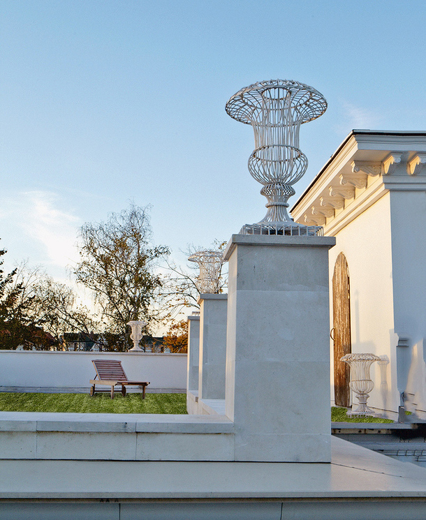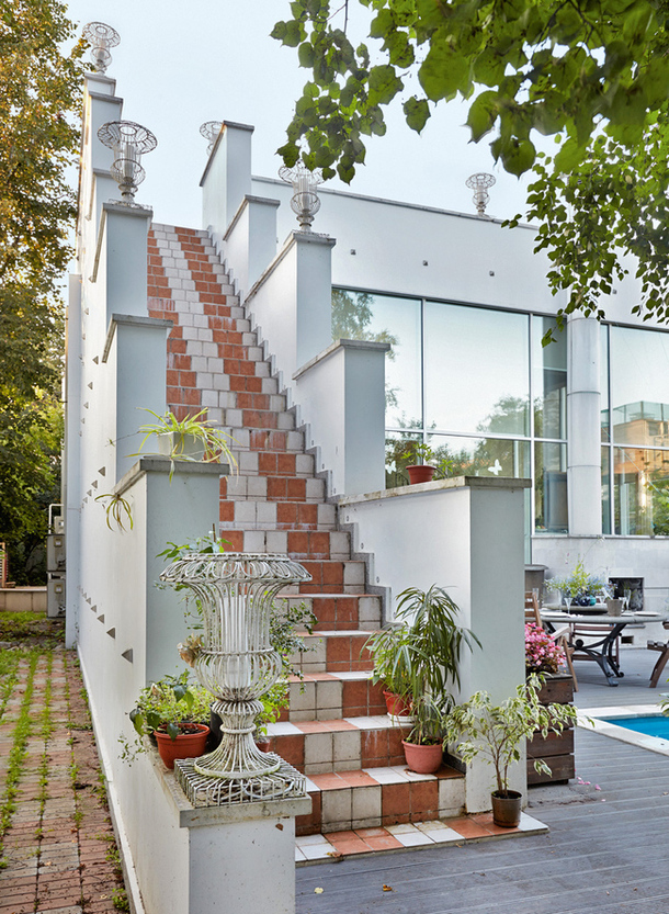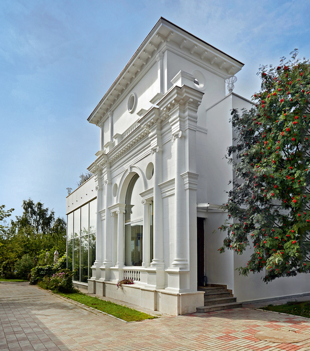 После такого предисловия уже не очень удивляешься при виде белого классического фасада с пилястрами — пятисотлетние традиции, они, конечно, обязывают. И только через пару минут понимаешь, что с классическим наследием архитектор Гликман обошелся вольно и не без юмора. Часть фасада действительно выполнена в точном соответствии с принципами архитектора итальянского Возрождения Андреа Палладио, но если с одной стороны вилла — классическая, то с другой — абсолютно современная.